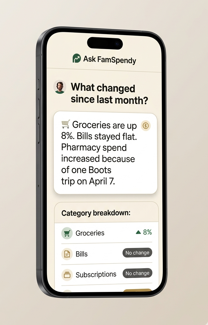 Recurring bills stay visible, spending patterns become easier to read, and follow-up questions do not require a spreadsheet session.