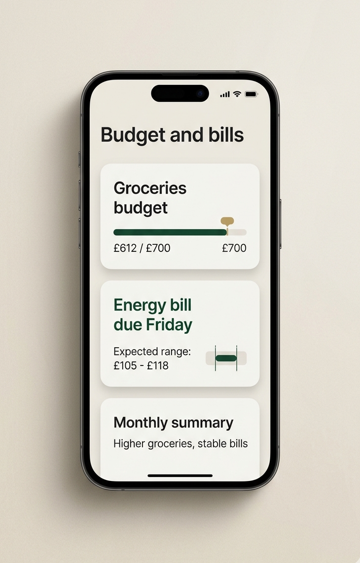 Budgets, recurring costs, and spending summaries help the household act earlier without turning money management into a second job.