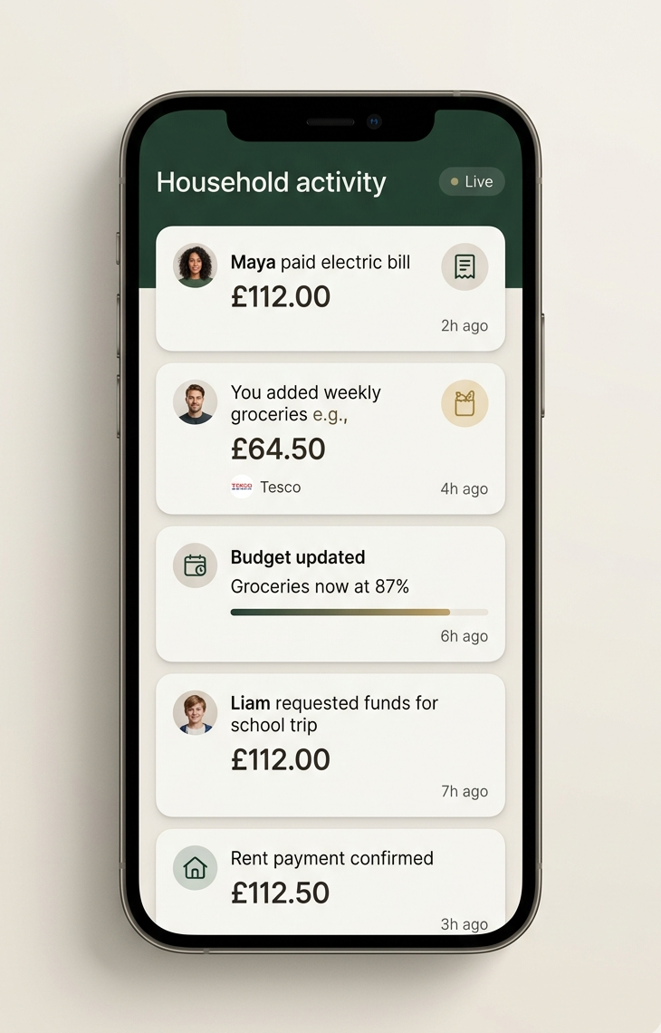 Partners and family members see what was spent, who paid, and what changed. The app is built around a household, not a single-person ledger.